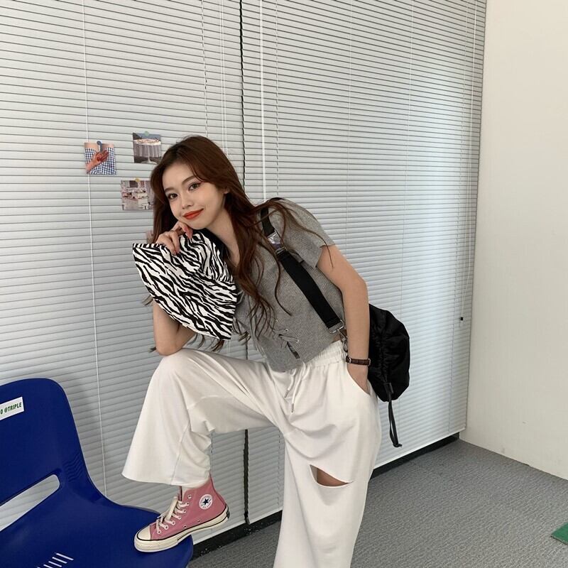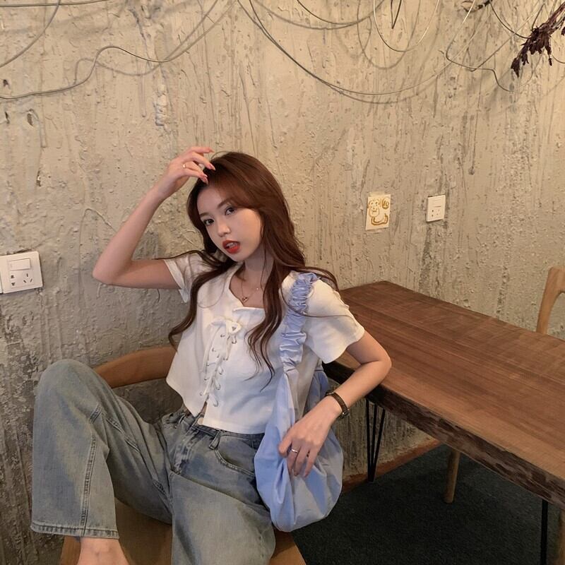 胸元のレースアップがかわいいクロップドTシャツ。